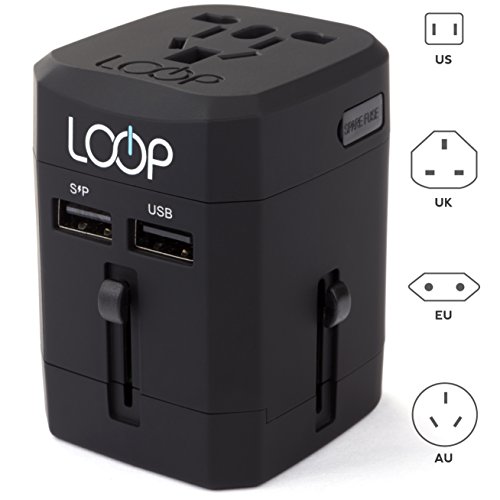 - Product Name: LOOP World Adapter Plug, Worldwide Travel Adapter Charger [US UK EU AU/CN] w/ Dual USB Charging Ports & Universal AC Socket - Safety Fused (Black)